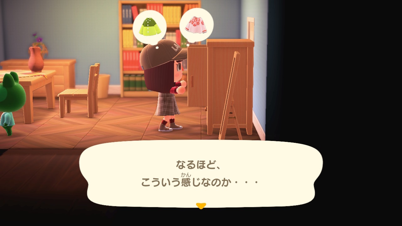 キャラにあげた服はクローゼットにちゃんとしまってあるんだ!ということに気づいた。服をどんどん買ってあげたいけど、仕立て屋のシステム上家の収納に服が飛んでしまうのが面倒ー。