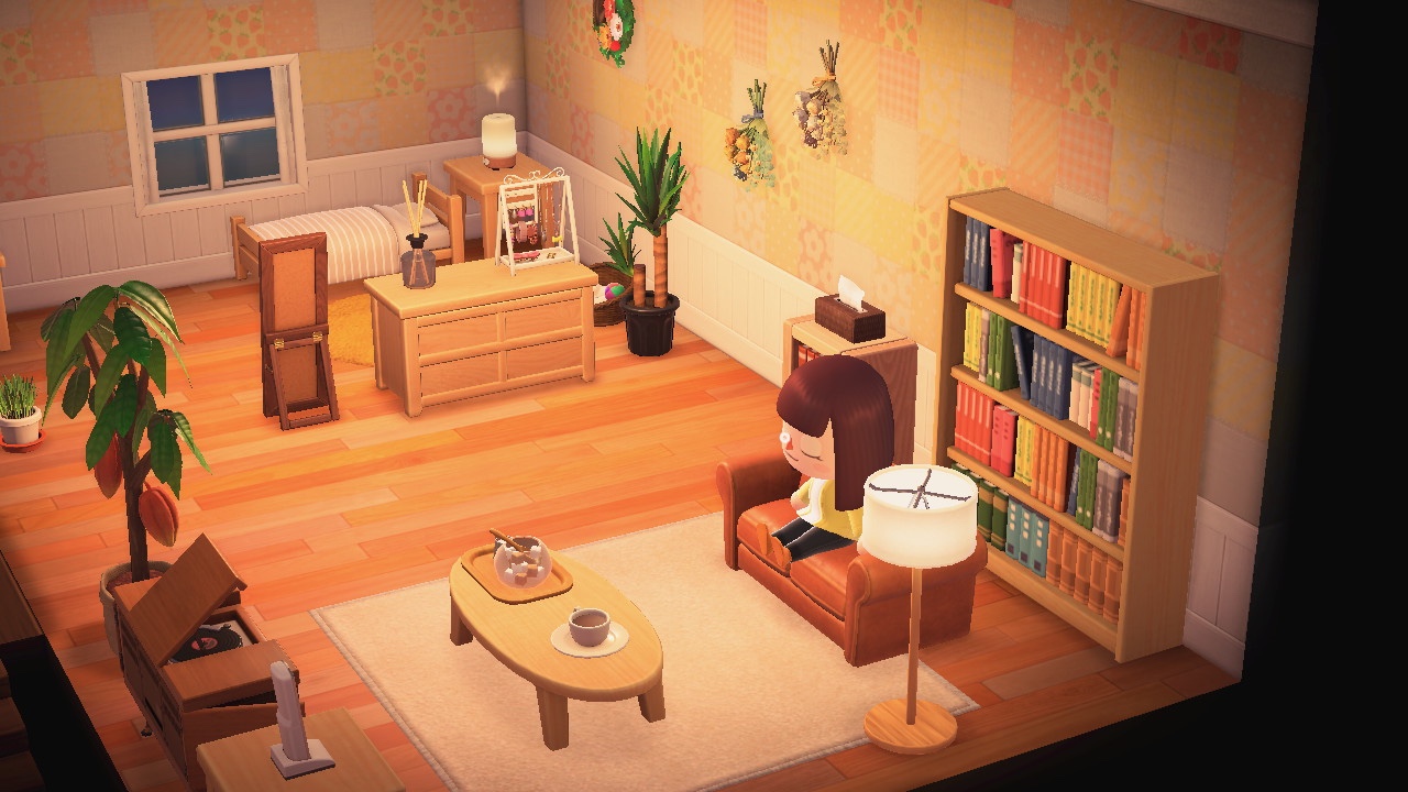 2階まで増築してるので、なんとなく自室風に。ハピ森のときから横長の部屋が好きなので、レイアウトはあまり悩まなかったかも。下に作ったキッチンの方が散らかってて気に入らない…。カッティングボードは何処。