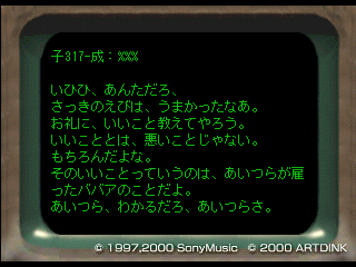 宗じいさんが奥さんに美顔クリームを塗りたくっているそうなので、とりあえず渡してみたがそんなものじゃもうダメだもんねと言われる。誰かが生体通信のできるところに来て助けて、という声も聞こえた。クリームはもっと強力なものじゃないとダメなのか、と引き返そうとしたら今度はキッズが現れた。