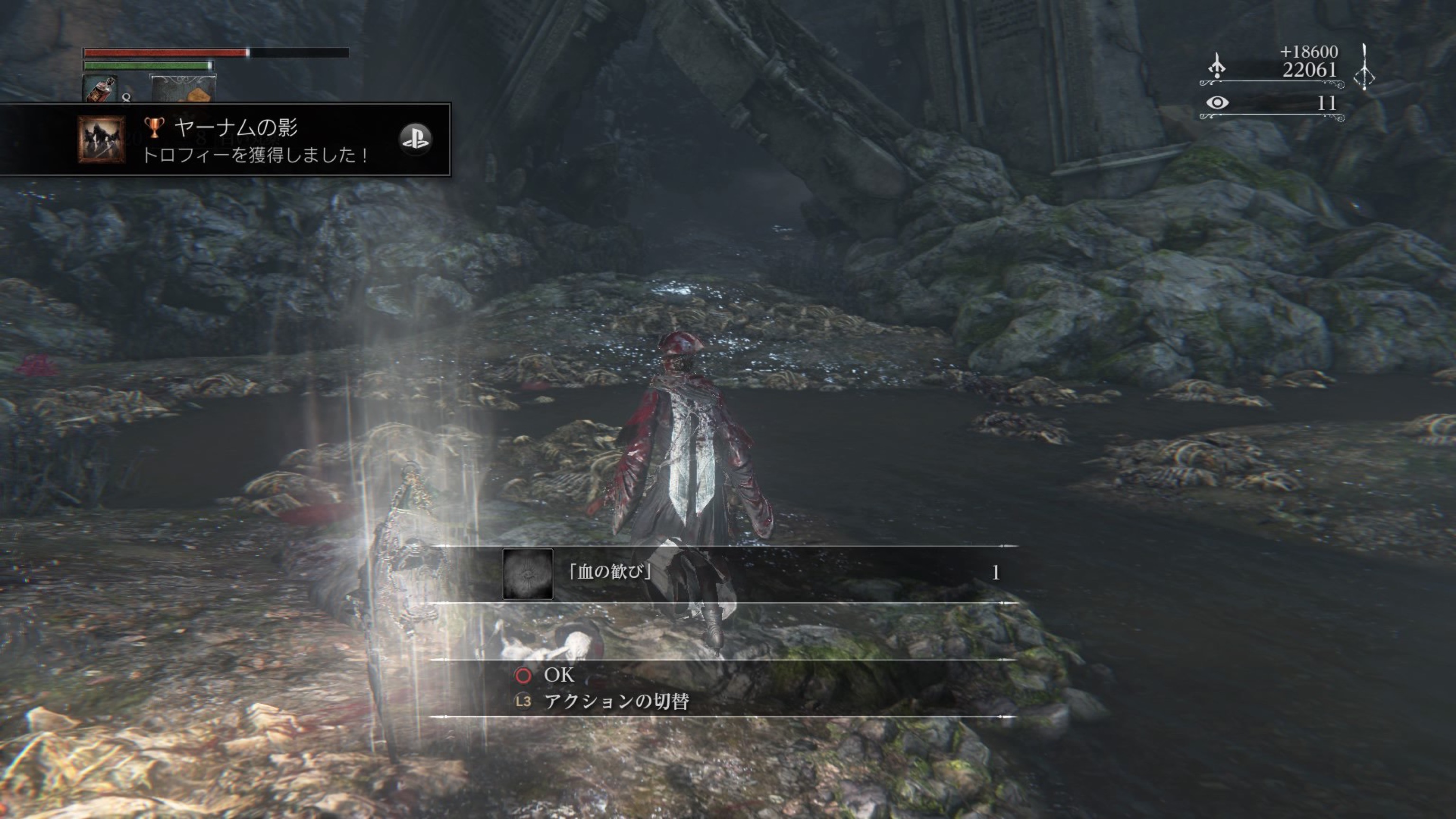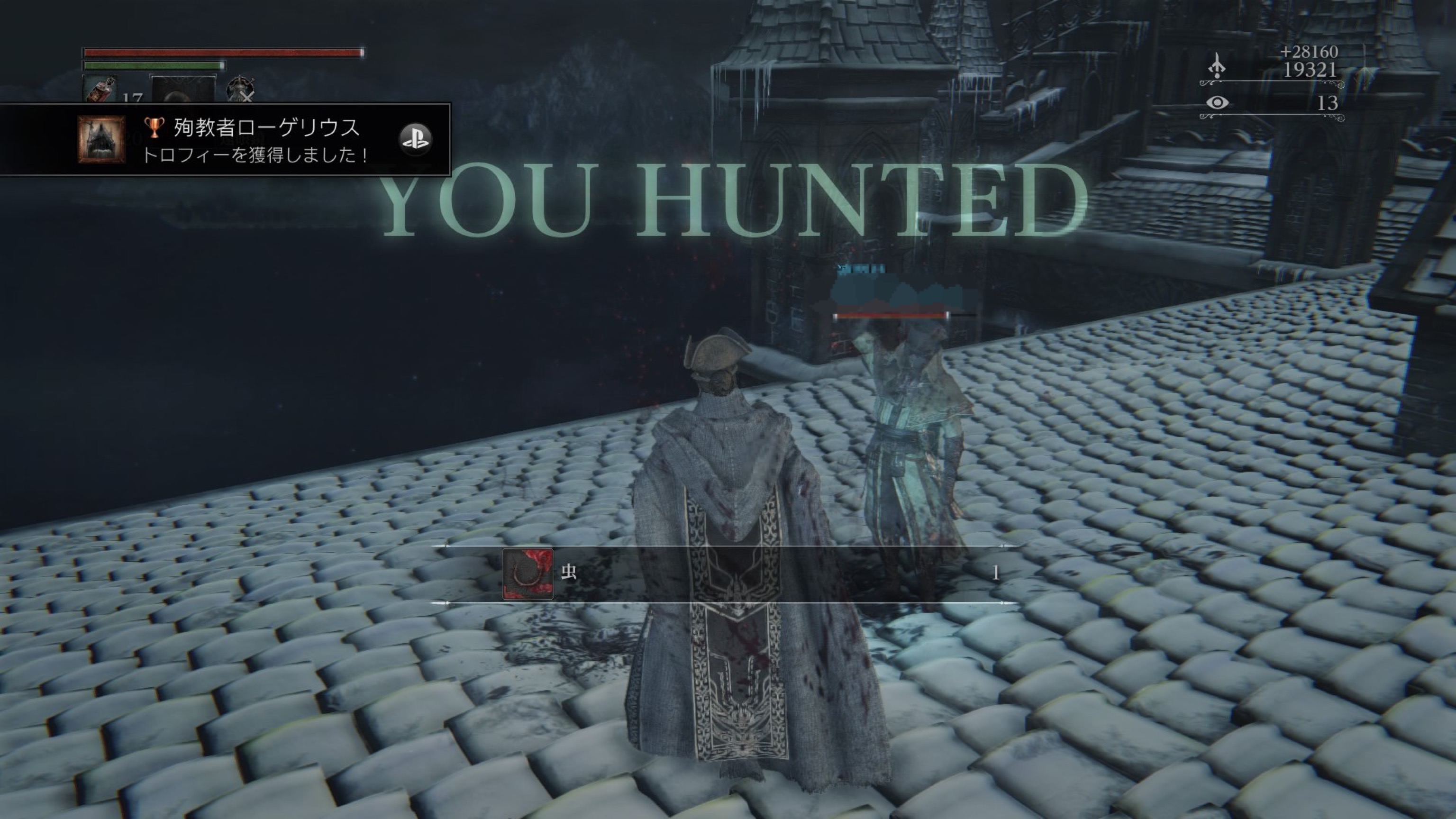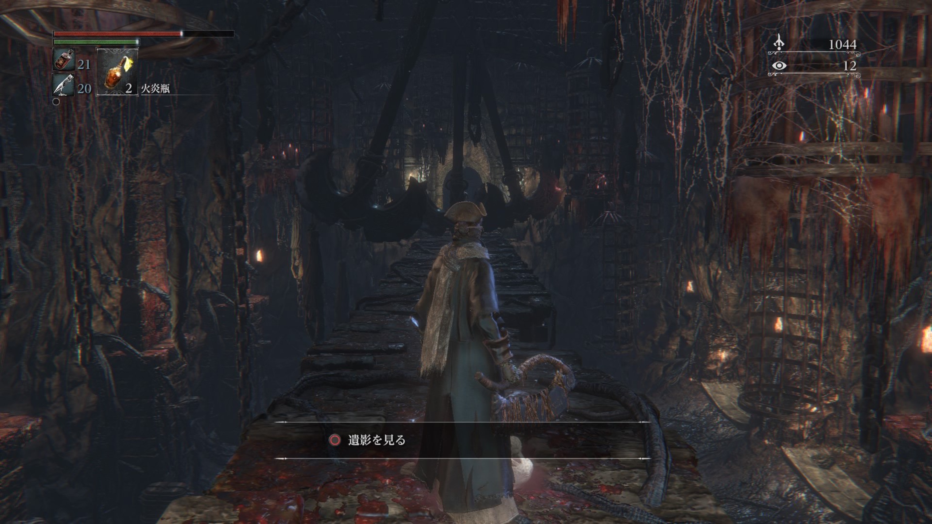 ボス前の屋根を渡っていくところに血痕があり、やっぱりみんな落ちるんだなぁと思ったら私も落ちました。ツルッとね、ツルッと…。