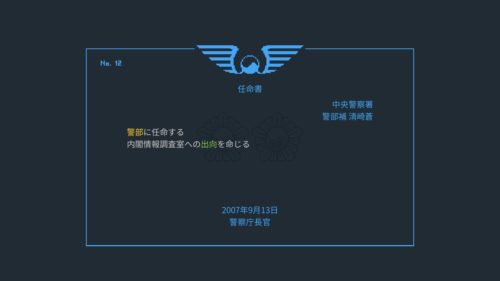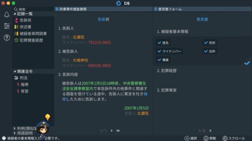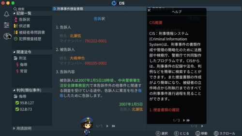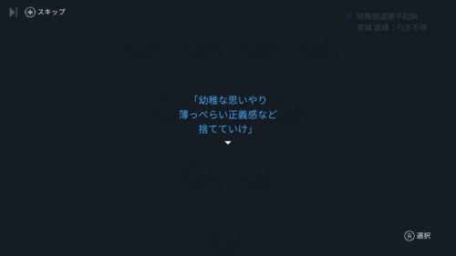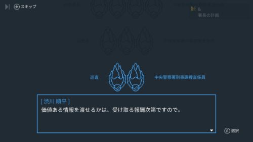 ともあれこれは爽快感を味わうものでも、正義の剣で悪人をぶった斬る話でもない。それでも面白かった。起訴してやりたいくらい憎い奴がいても、シナリオの分岐ルートを見るとこいつは不起訴にしないといけないとか。主人公の清崎がプレイヤーの意思に沿うとは限らない。その手を汚すこともある。