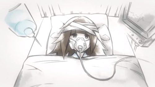 アリスが目を覚ますとそこは病室だった。イラストから察するに彼女の意識はなかったのだろう。